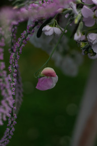 On 20 July 2025, our clients Sam and Alex got married in their garden surrounded by flowers and just 20 of their closest family and friends. It was a joy to put together this bridal bouquet for Sam, a brief that read "I'd like pink, from "barely there" to something like bubblegum, with something surprising I haven't thought of, I trust you!" Two of my favourite elements of any brief; surprises and trust. And so we made this compilation of the purest white sweet peas, sweet peas ever so slightly blushing, soft pink garden roses, scented rosemint, the tiniest gypsophila kermisina, pinky-lilac night-scented stocks, spiked statice suworowii, campanula bells, and "bubblegum" cosmos. The surprise elements were the silvery grey poppies and bronze grasses; the poppies adding an unexpected gradient from pink, to lilac, to a stone-grey-purple, and the grasses catching the light like delicate jewellery.